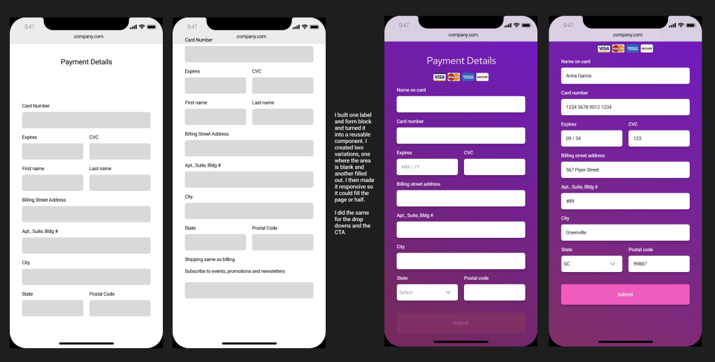 I’ve had experience mostly designing responsively for the web with some native app design. I’m passionate about the who and the why behind designs. I’ve been the only designer on a product, owning everything from research, to prototypes, testing and UI. I’ve worked on large teams, collaborating with other designers, product owners and stakeholders to align on a common goal and working together to create a cohesive experience. I enjoy thinking about the many different ways a user can interact with a product and working with researchers to test assumptions. There’s always something to learn and a new challenge to tackle. Here are some examples of my work: